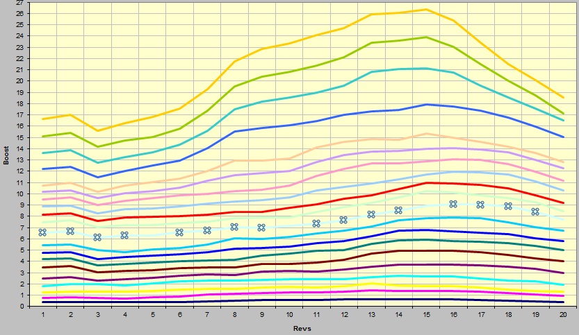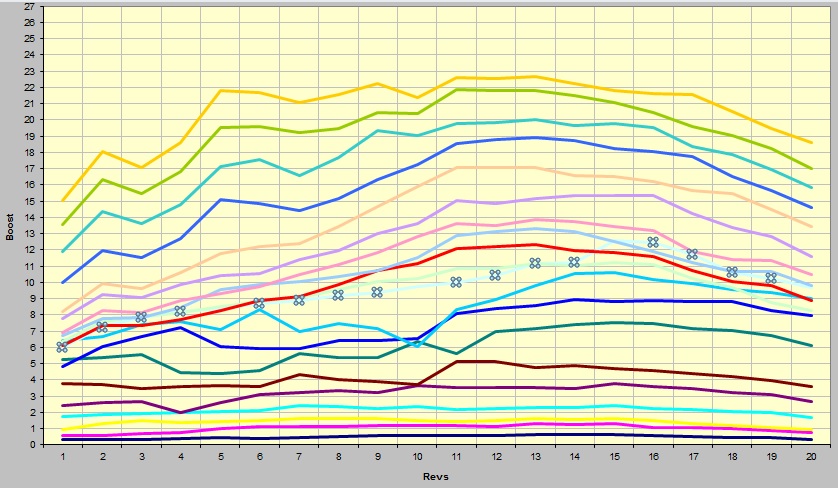 Das Diagramm kann wie folgt als Hilfe eingesetzt werden: Hat man brauchbare AFR-Werte geloggt und die Map angepasst, sollte man sich das dazugehörige Diagramm anschauen. Gibt es einzelne Ausreisser oder überschneiden sich die Linien, gilt es sie anzupassen. Wie bereits unter Logging erwähnt, wird nie eine einzelne Zelle benutzt, sondern ein Produkt mehrerer Zellen, also unterschiedlicher Werte. Deshalb sollte nie nur ein einzelner Zellenwert verändert werden, sondern auch die Nachbarzellen. Mit dieser Information im Hinterkopf, gilt es jetzt die benachbarten Kraftstofflinien so zu verschieben, daß das gewünschte Ergebnis erzielt wird. Nach der Anpassung wieder fahren, loggen und prüfen, ob die Änderung die gewünschte Wirkung erzielt hat, ggf. wieder anpassen. Nach einer Weile bekommen Sie raus, worauf es ankommt und das Tunen geht schneller von statten. Anfangs sollte man allerdings genügend Zeit einplanen... |