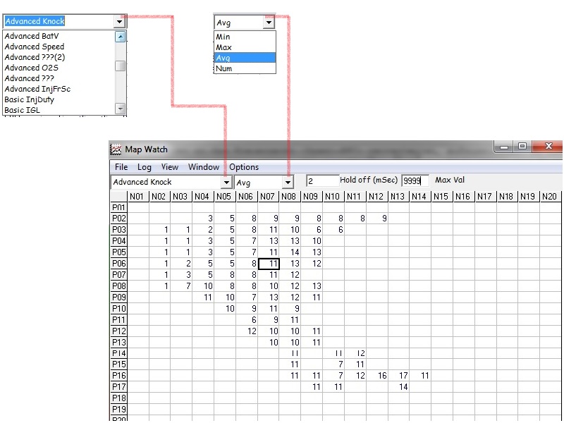 | "Map Watch" dient auch der Betrachtung der erfassten Daten. Hier kann die gespeicherte Log-Datei geladen und analysiert werden. Hat man zum Loggen nur "Advanced" unter "Monitor" ausgewählt, muss grundsätzlich vor dem Laden des Logs, die Map geladen werden, mit der die Aufzeichnung stattgefunden hat. Es gibt oben zwei Dropdown-Felder. Im folgenden Beispiel (Abb. 3) sind im ersten Feld die Klopfwerte (Advanced Knock) ausgewählt. Hier lassen sich die erfassten Werte für alles anzeigen, das aufgezeichnet werden kann, abhängig von den gewählten Einstellungen unter "Monitor" (siehe Abb. 1). Im zweiten Feld wählt man aus, ob die Maximal- (Max), Minimal- (Min) oder Durchschnittswerte (Avg) angezeigt werden sollen. Mit der Num-Funktion lässt sich herausfiltern, wie viele Messungen in der jeweiligen Zeile erfasst worden sind. Werte mit nur einer Aufzeichnung haben wenig Aussagekraft. Meine Regel sind mindestens vier geloggte Werte, alles was darunter liegt wird gelöscht. Dann gibt es noch zwei weitere Filter, die sehr nützlich sein können. Unter "Hold off (mSec)" lassen sich Werte ausblenden, die nicht lange genug gehalten worden sind. Stellt man beispielsweise 2 mSek ein, werden nur Werte dargestellt, die für mindestens 2 Millisekunden bestanden haben. Alles was kürzer als die eingestellte Zeit auftrat, wird nicht angezeigt. Der letzte Filter ist der "Max Val", der Maximalwert. Nach der Einstellug des Maximalwertes, werden alle Werte, die höher als der eingestellte sind, ausgeblendet. |